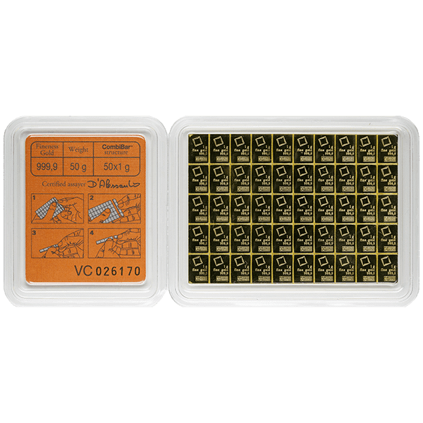 Produced By Valcambi Suisse, One Of The Most Respected Swiss Refineries, Each Gold CombiBar Is Sealed In Protective Packaging And Accompanied By A Certified Assay Card Verifying Its Authenticity, Weight, And Purity. Recognized Worldwide, The 50 Gram Gold CombiBar Combines Swiss Craftsmanship, Practical Utility, And Intrinsic Value — Making It A Smart Choice For Investors Seeking Both Portability And Flexibility In Their Gold Holdings.